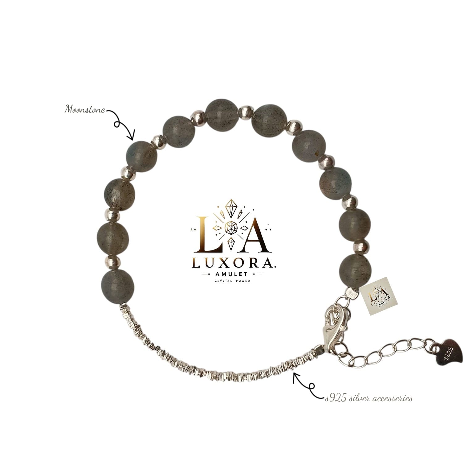 This elegant bracelet features luminous Moonstone beads paired with refined S925 Silver accents. Known for its calming and clarifying properties, Moonstone promotes emotional balance, mental focus, and spiritual growth, making it a versatile accessory for daily wear.